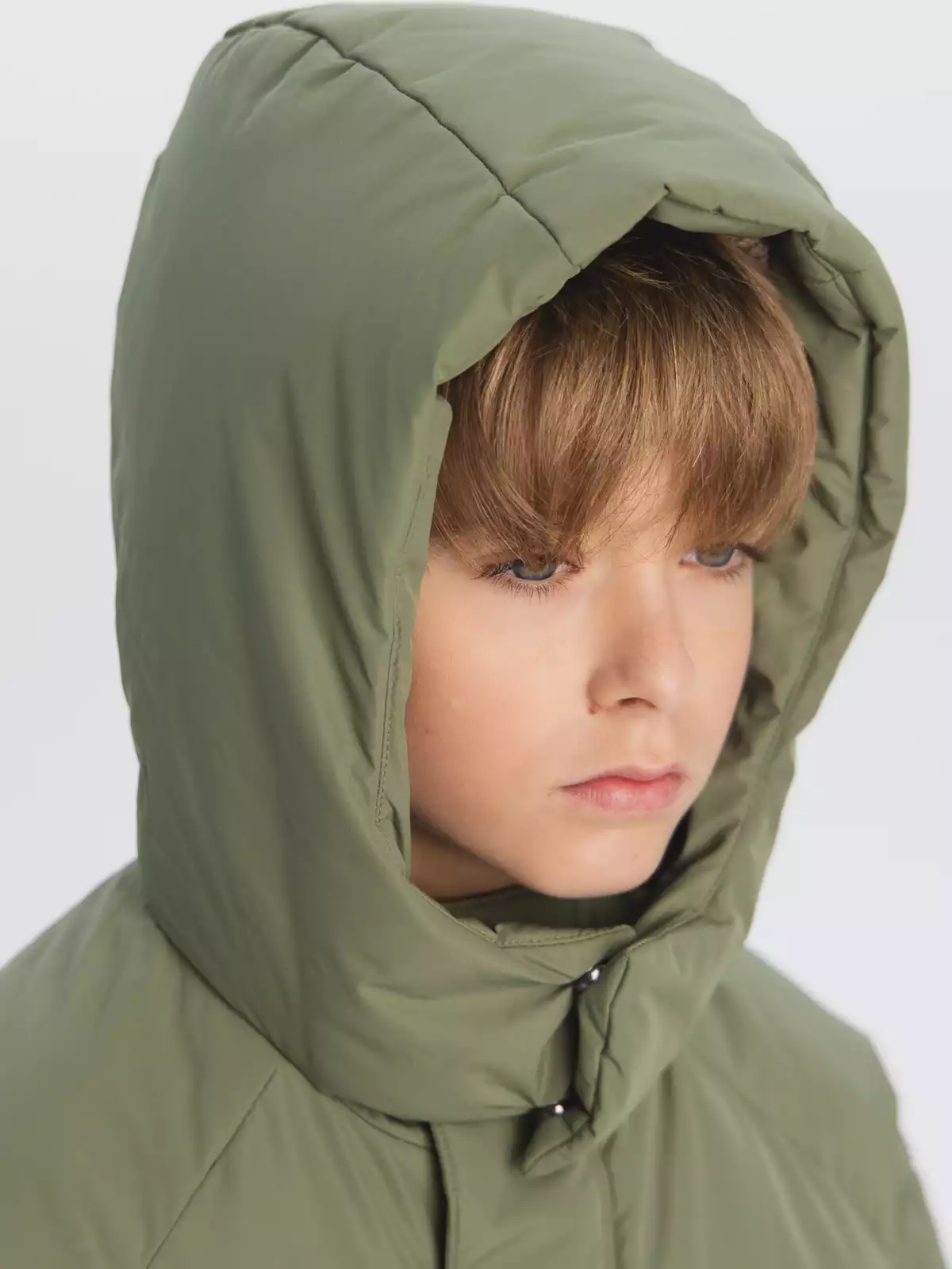 - Несъемный капюшон с дополнительной фиксацией на кнопки в области горловины;