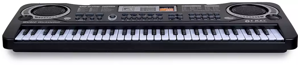 - 61 клавиша, микрофон, 6 мелодий, 16 тонов, 10 ритмов, ударные, звуковые эффекты, запись, аккорды, громкость, темп, блок питания 6v, 4 штуки aa.