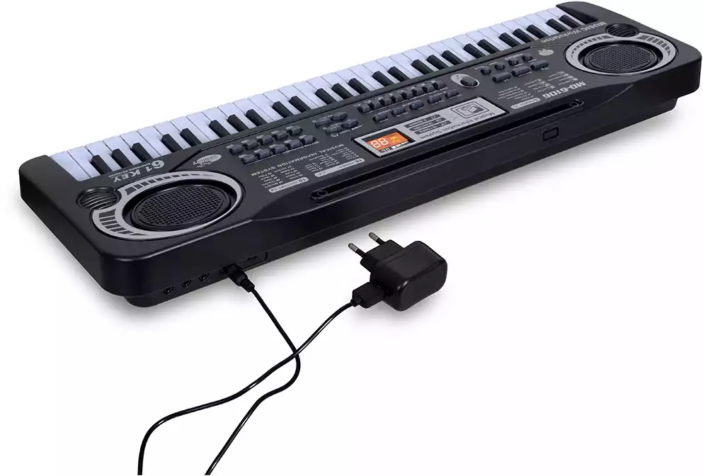 Синтезатор в элегантном черном дизайне, корпус из прочного пластика. Это замечательное пианино с 61 клавишей позволит вашему ребёнку окунуться в мир музыки и творчества. Представьте, как он с удовольствием будет создавать свои первые мелодии, экспериментировать с 16 тонами, 10 ритмами и даже записывать свои шедевры! Синтезатор оснащен микрофоном, так что ваш юный музыкант сможет исполнять свои любимые песни, добавляя к ним забавные звуковые эффекты и ударные. С помощью 6 установленных мелодий он сможет быстро освоить азы игры, а функция аккордов поможет ему создавать более сложные композиции. USB-порт позволит прослушивать любимые песни и откроют дополнительные возможности для экспериментов.