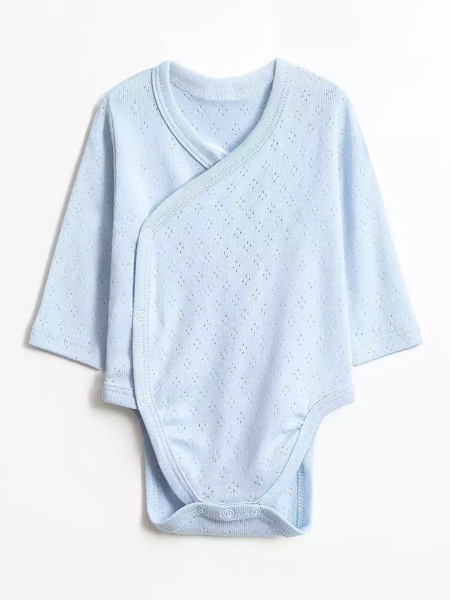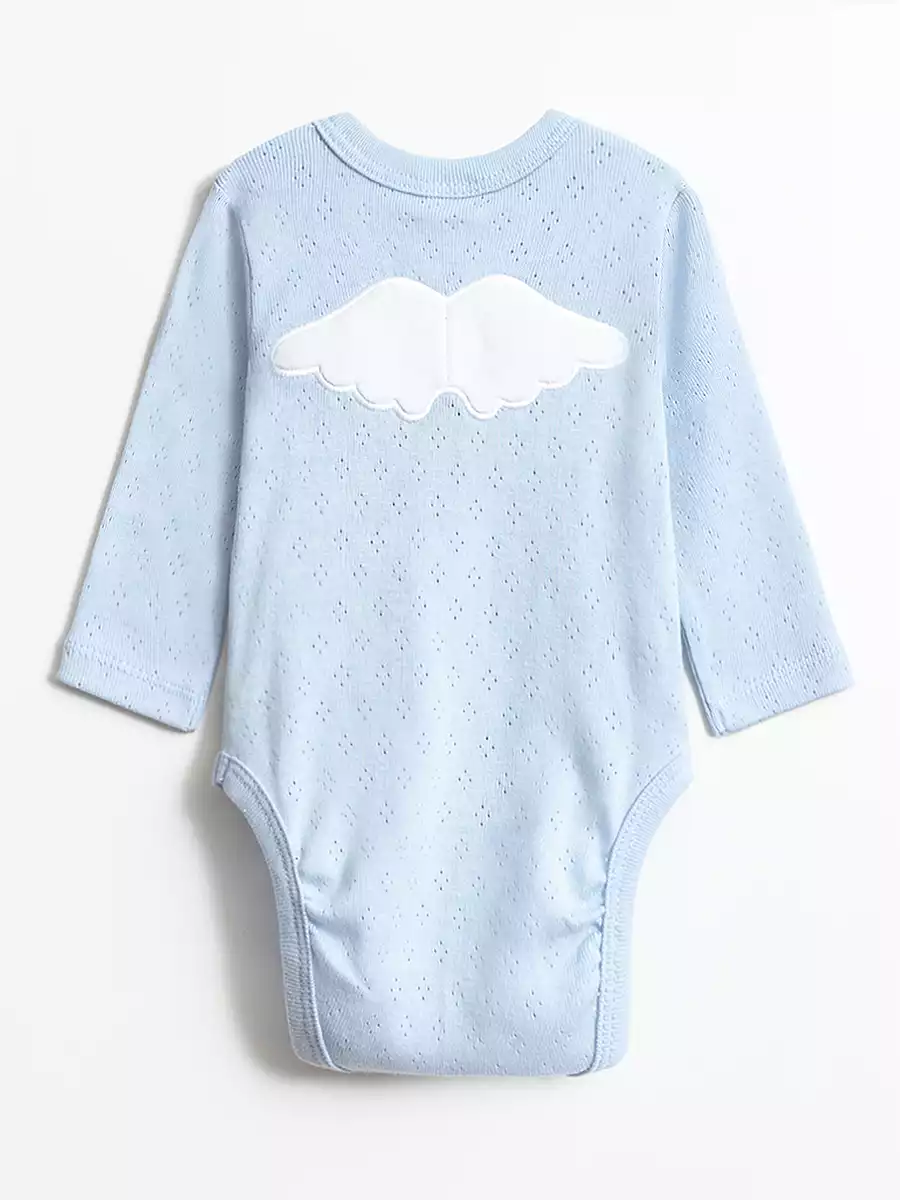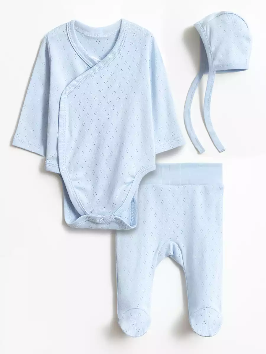 Набор одежды для новорожденных включает в себя боди с длинным рукавом, ползунки и чепчик. Все элементы детской одежды изготовлены из 100% качественного мягкого хлопка. Боди имеет круглый вырез горловины, кпопки расположены сбоку, пришивной бантик и крылышки на спине, ползунки свободного кроя, не сковывают движения и подходят для ношения подгузника.